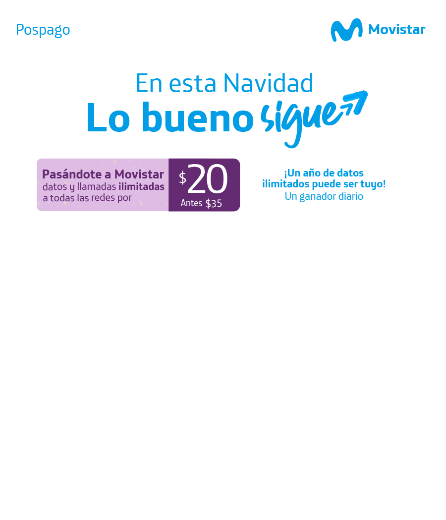 Promoción vigente del 1 al 31 de marzo 2022. Promoción 20GB full de bienvenida aplica al contratar planes ilimitados social básico y social premium con smartphone y solo SIM. Promoción válida para contrataciones, renovaciones y portaciones con smartphone y solo SIM. Oferta de planes ilimitados vigente del 1 al 31 de marzo 2022. Los beneficios incluidos varían de acuerdo con el plan contratado. Mensualidades publicadas incluyen: Plan + Financiamiento del teléfono + Plan de protección del smartphone. Contrato a 24 meses. Precios incluyen IVA. Promoción 20GB full de bienvenida con vigencia de 60 días son acreditadas en el momento de la activación y se consumen antes del plan de datos contratado, 20GB full no son transferibles y son exclusivos para consumir dentro del territorio nacional. Más información sobre de planes y condiciones aplicables a estas promociones en www.movistar.com.sv/terminos-y-condiciones-comerciales o por WhatsApp al 7119-7119